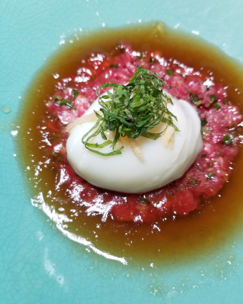 This is made with Angus beef, poached egg and tosazu sauce (a seafood style vinegar). Watch the video as the egg breaks into the tartare:
