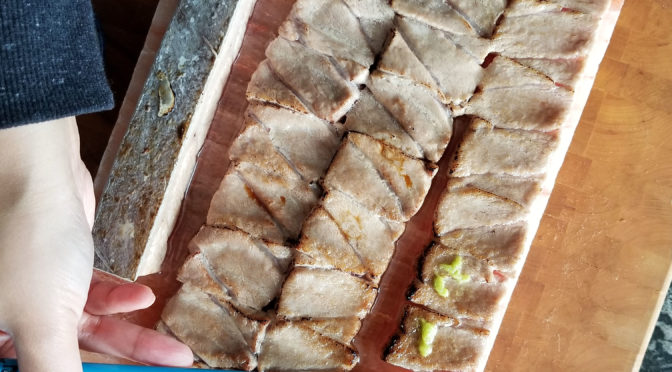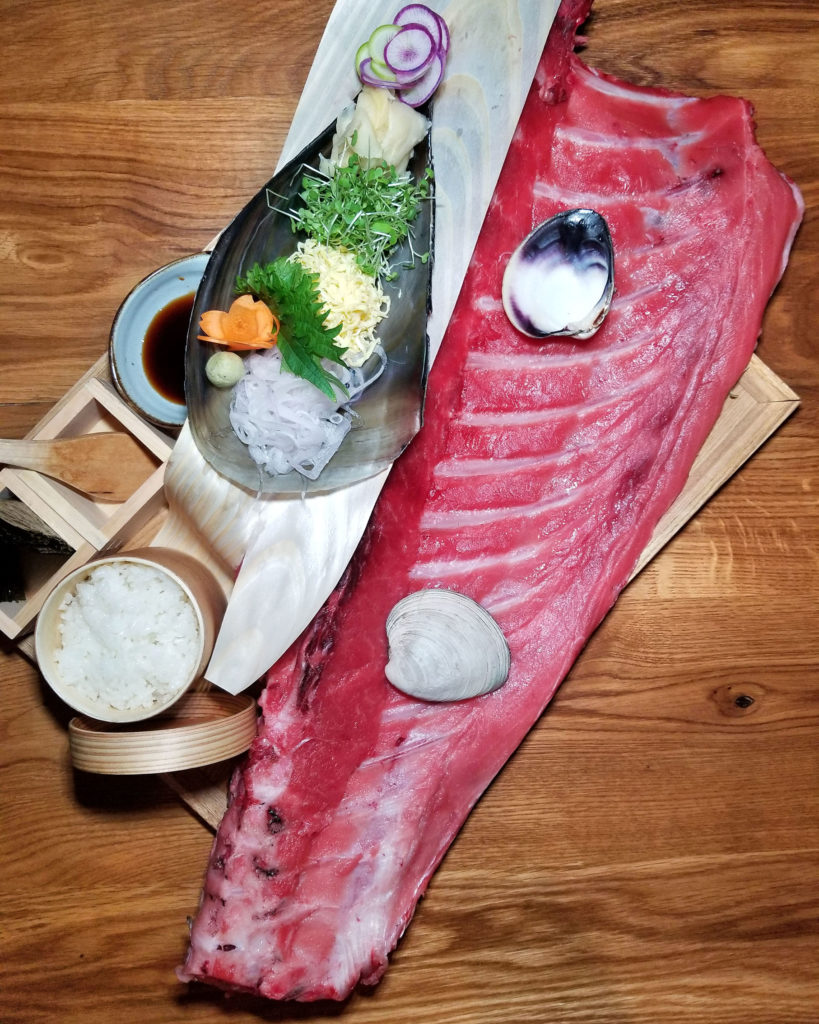This next item was on special: bluefin tuna temaki. It’s a rib section of bluefin tuna, served with seashells for scraping the meat out and making hand rolls with all the fixings.