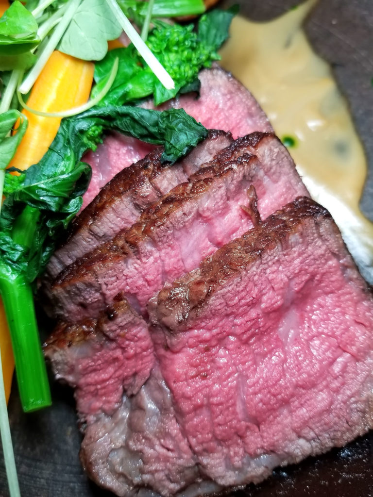 Washugyu is an American Black Angus and Japanese Wagyu cross breed that achieves a great balance of beefy flavor and tender marbling. This is the same stuff I sell in my shop, pretty much. Anyway, it was incredibly tender and flavorful. They got a nice sear on the meat too. 9/10.