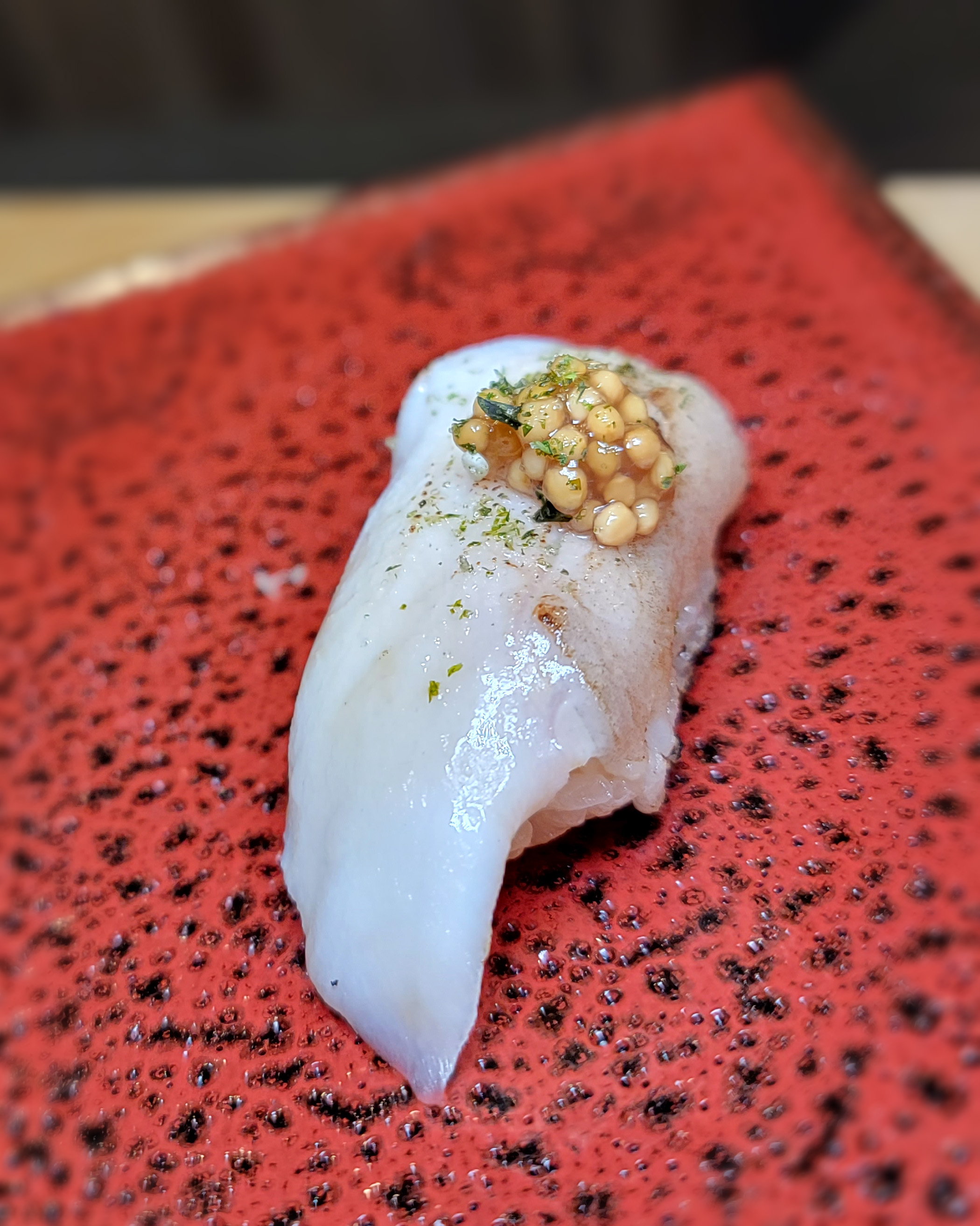 This small sushi counter offers an $88 omakase, which consists of two appetizers, ten pieces of nigiri sushi, two hand rolls and a bite of dessert. Here are the two apps: