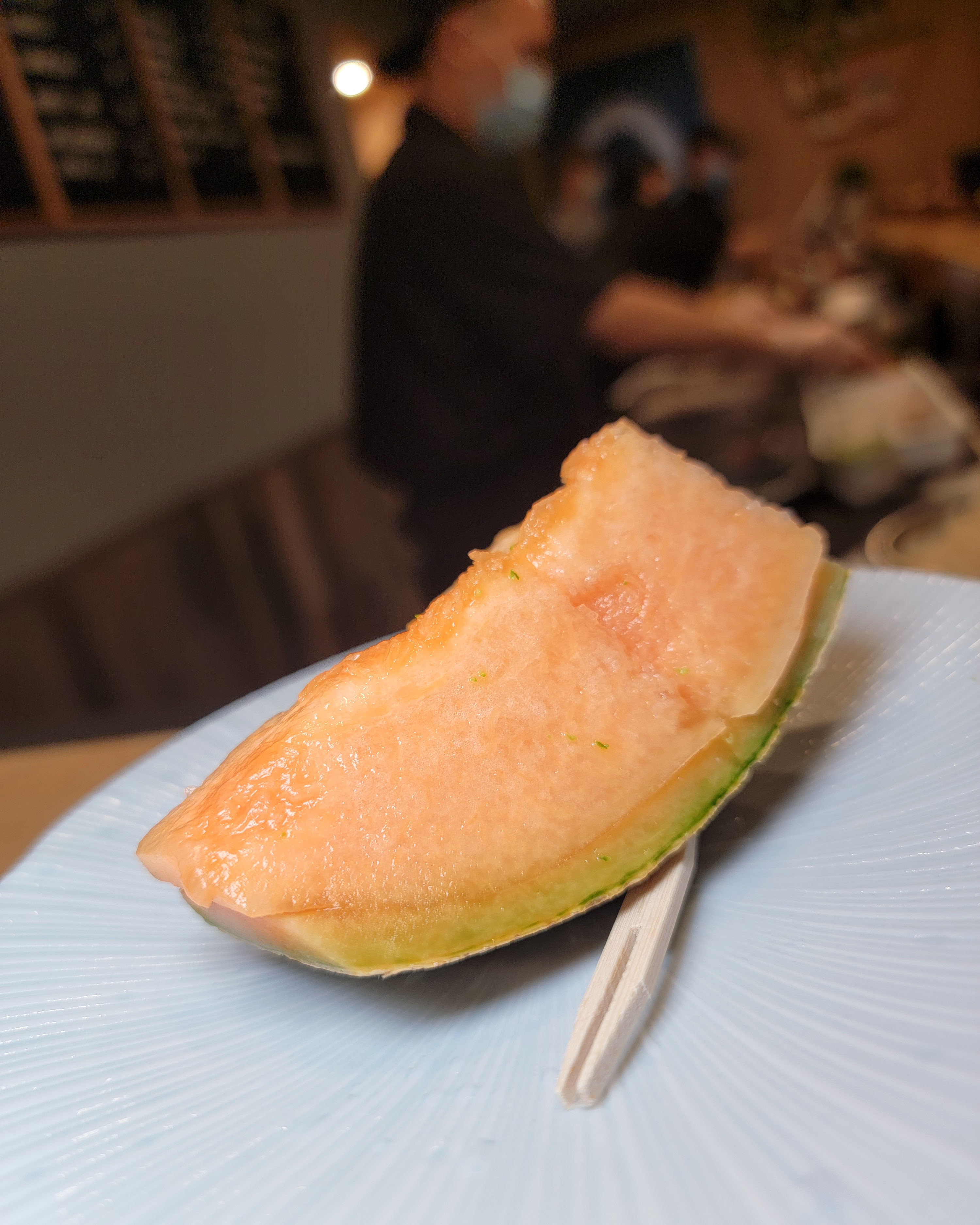 The hand rolls (eel + foie gras, and tuna) and dessert (melon):