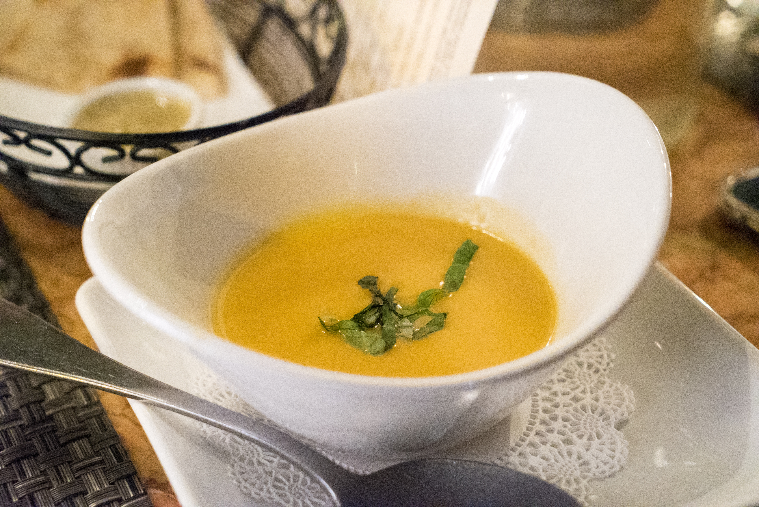 Next was a seasonal soup that they were offering, made from butternut squash and apple, and garnished with some basil. This was really smooth, not too filling, which I was happy about, and slightly sweet and crisp from the apple. It had great depth.