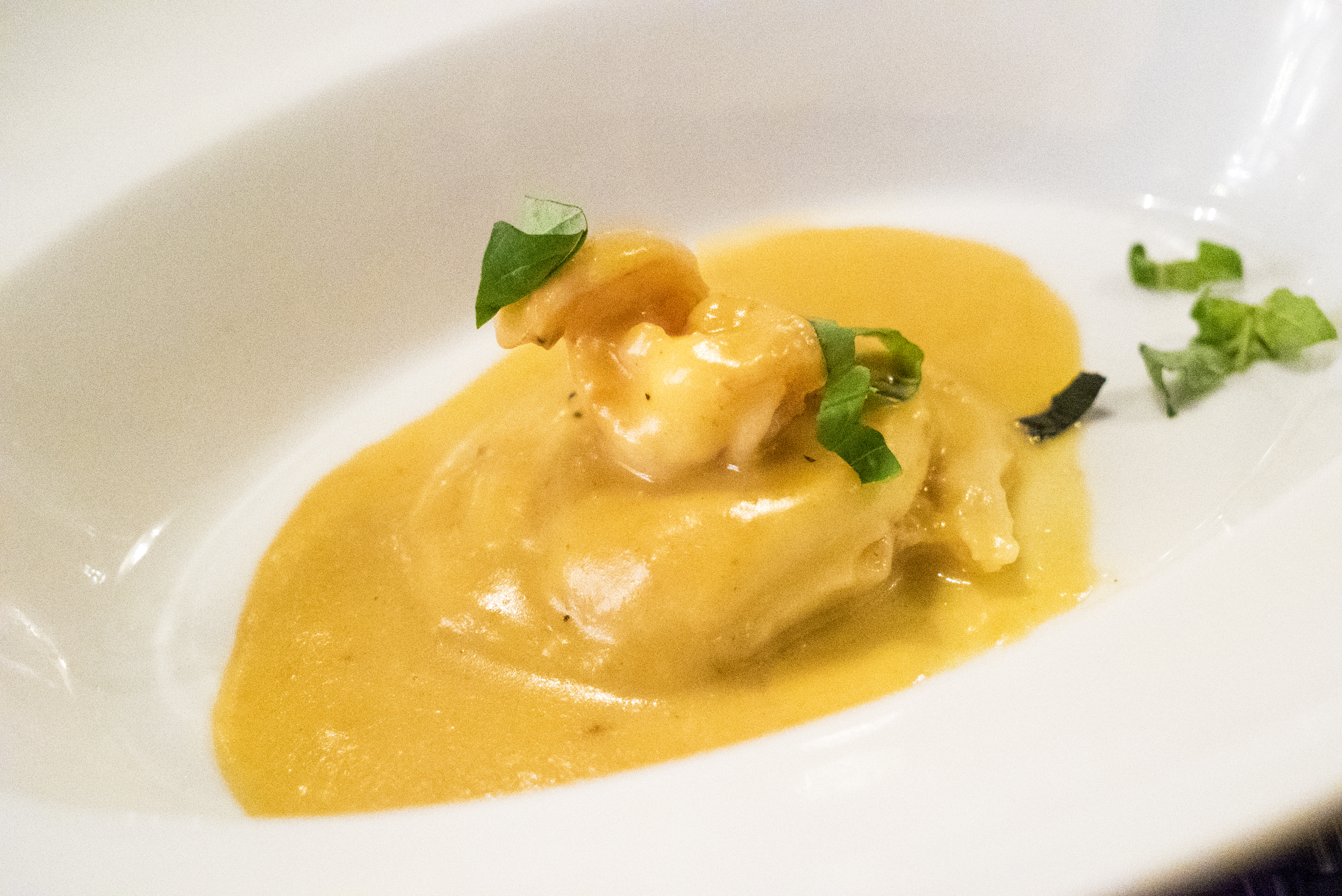 The final savory dish was lobster ravioli in a butternut squash sauce and topped with a butterflied shrimp. The ravioli stuffing was lobster, basil, onion and shallot, and the pasta was hand made on site by Chef Golam. The squash sauce was similar to the soup course, but a bit more spicy and savory than the apple-infused soup.