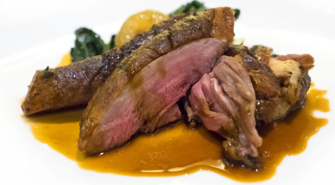 It was prepared skin-on, but I felt that it could have used a bit more crisp on the skin. Perhaps because it was plated skin-down, the skin lost some of the crisp it might have developed while cooking. Otherwise this was an excellent dish.