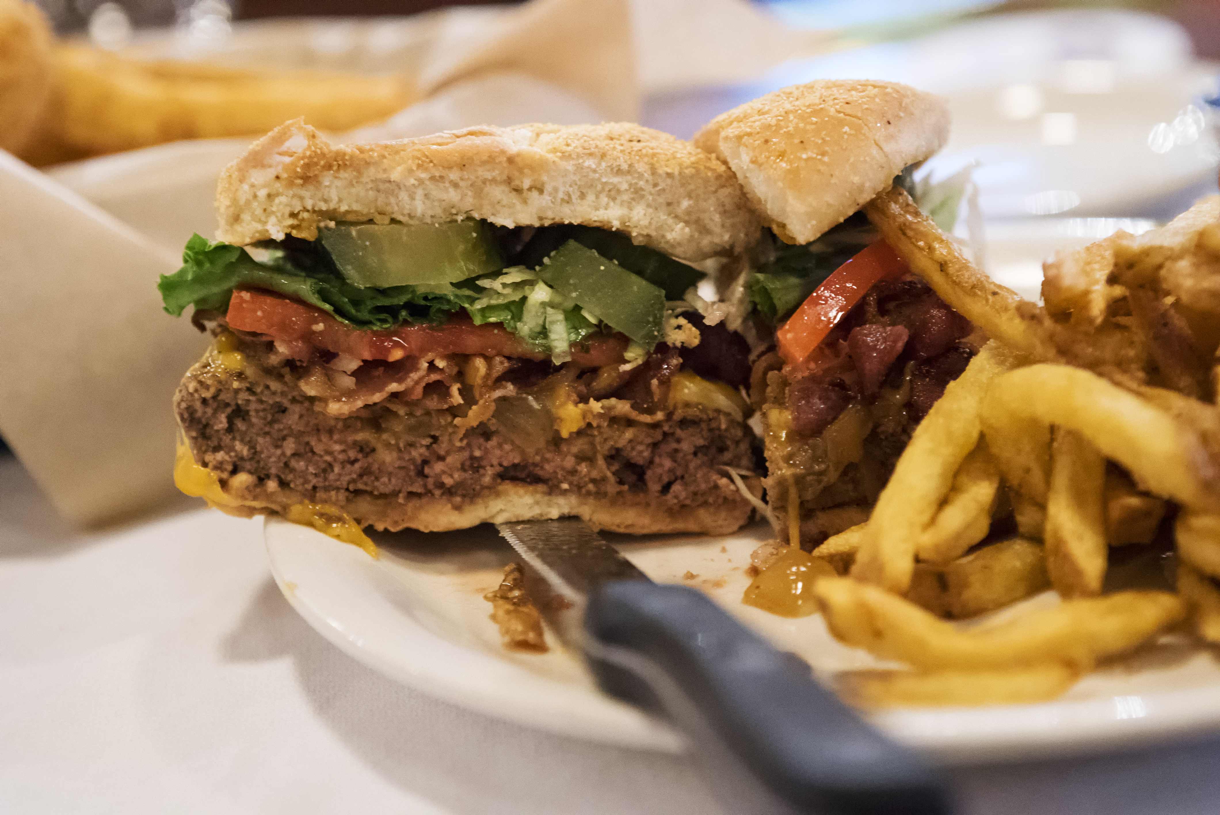 Anyway – it was nice and patriotic with the flag toothpick. It came with bacon, cheddar, grilled onions, lettuce, tomato, pickles and raw onion. Check the cut: