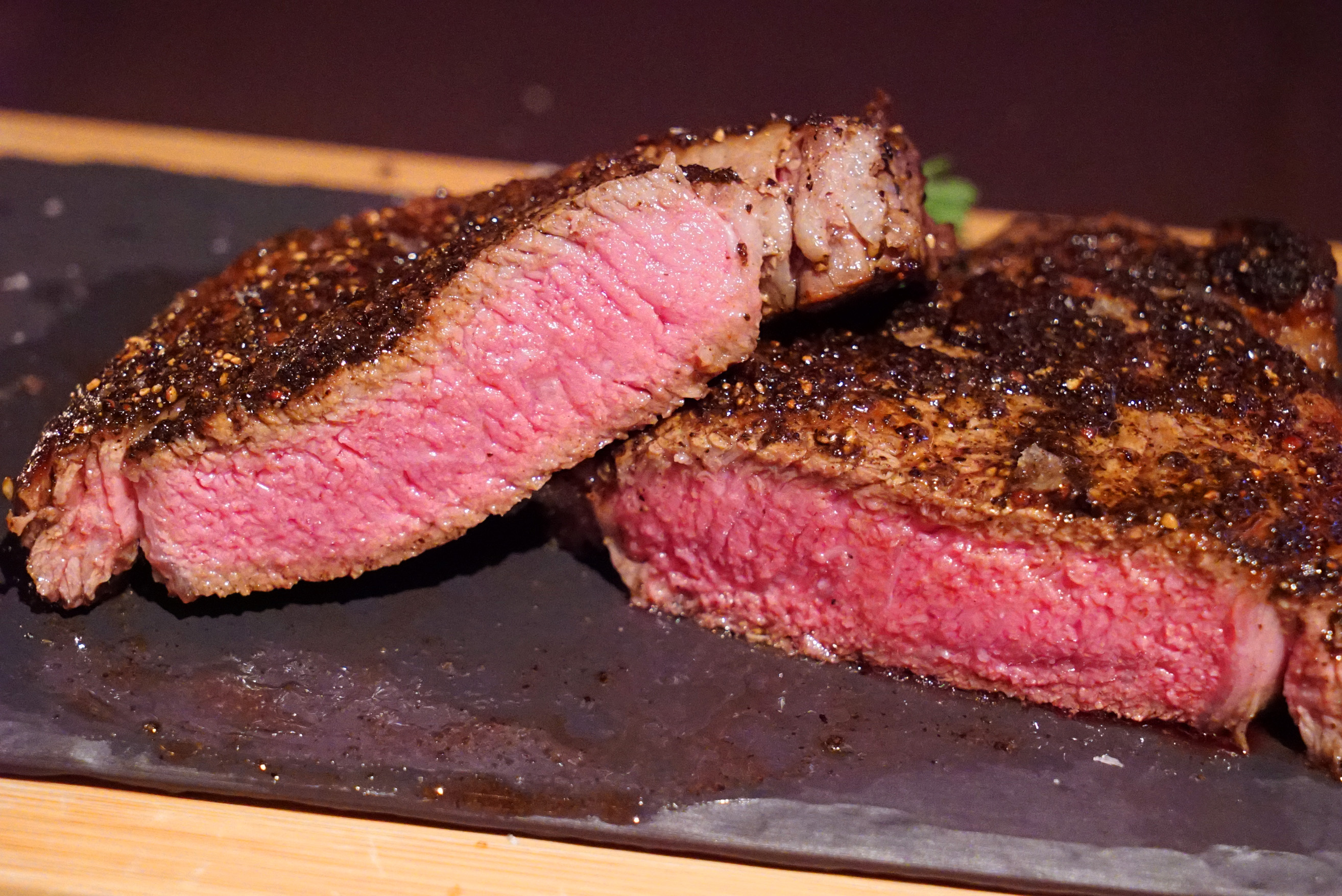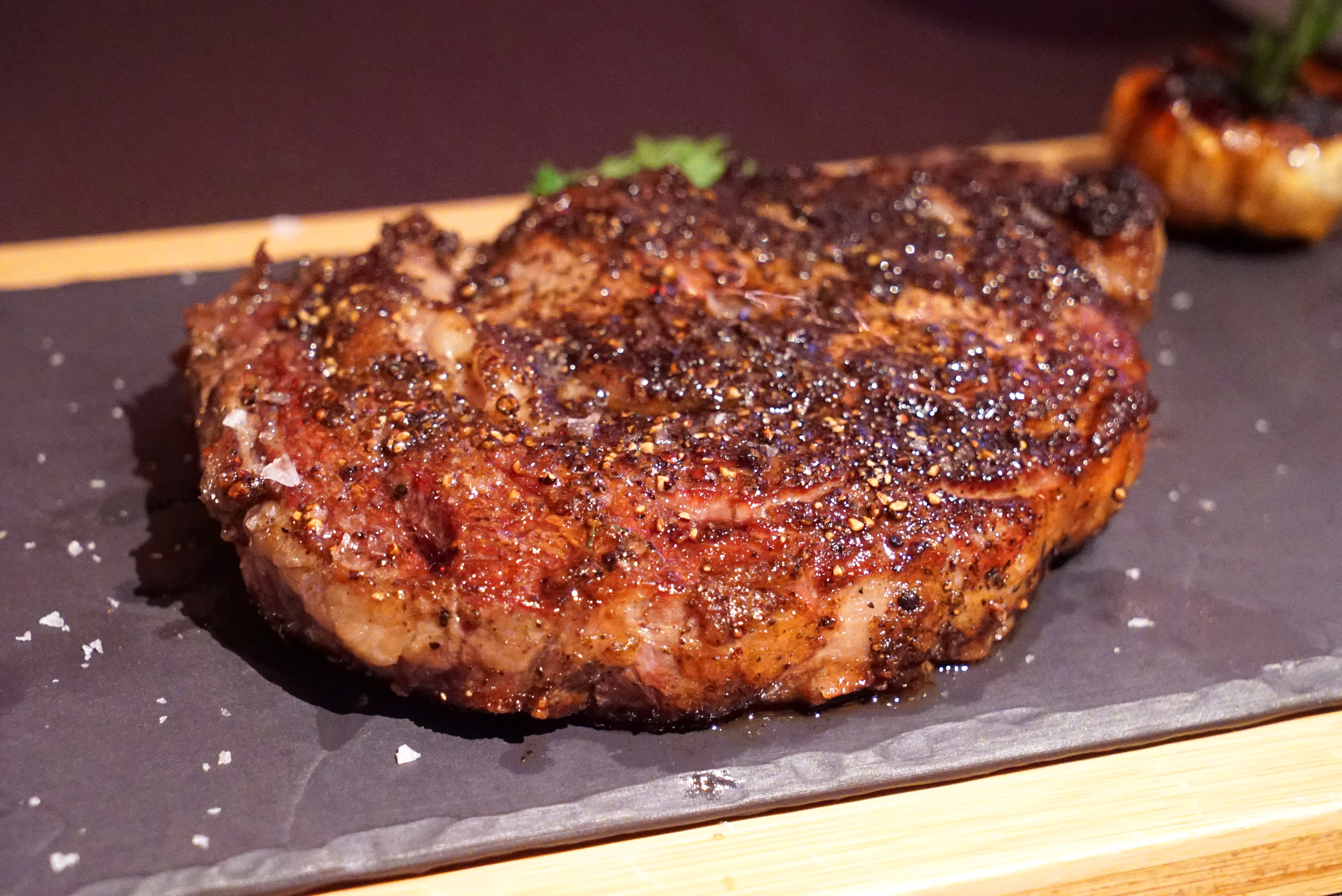 Portions for the steaks are a bit on the small side. The filet is only 8oz at $38; the strip is 12oz at $54; the Black Angus rib eye is 16oz at $50; and the porterhouse is 40oz at $47/pp, which is $94. Since it is only offered for two, they may as well just say $94 on the menu instead of using the per person cost. I’m uncertain whether you can order it for three and have it be something like a 60oz cut. Plating for the steak was really pretty: a wood tray with a stone inlay plate.