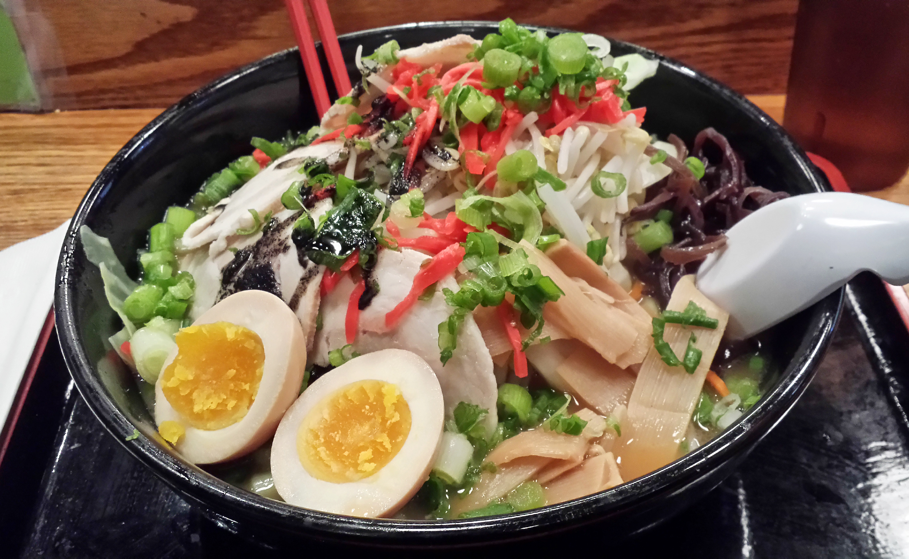 The “whopper” bowl is amazingly huge. It comes with tons of wavy egg noodles, all the fixings from the Terakawa ramen (ginger, mushrooms, LOTS of sliced pork, scallions, bamboo shoots, bean sprouts), the black garlic oil seasonings from the Ma-Yu ramen, a full boiled egg and fresh cabbage. This is a fuckload of food to eat for only $14!!! The shit was mounded high like a mountain peak, and nearly overflowing.