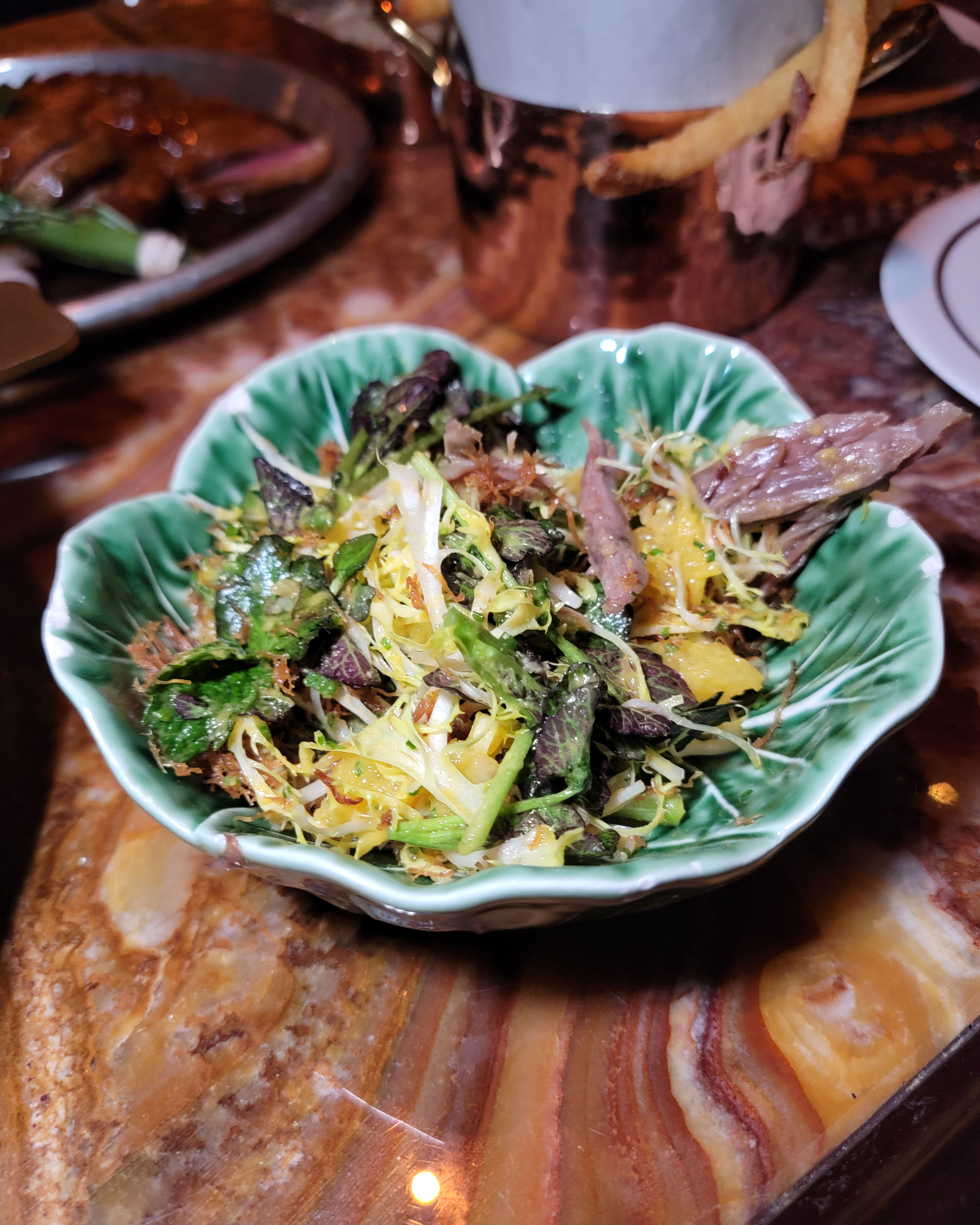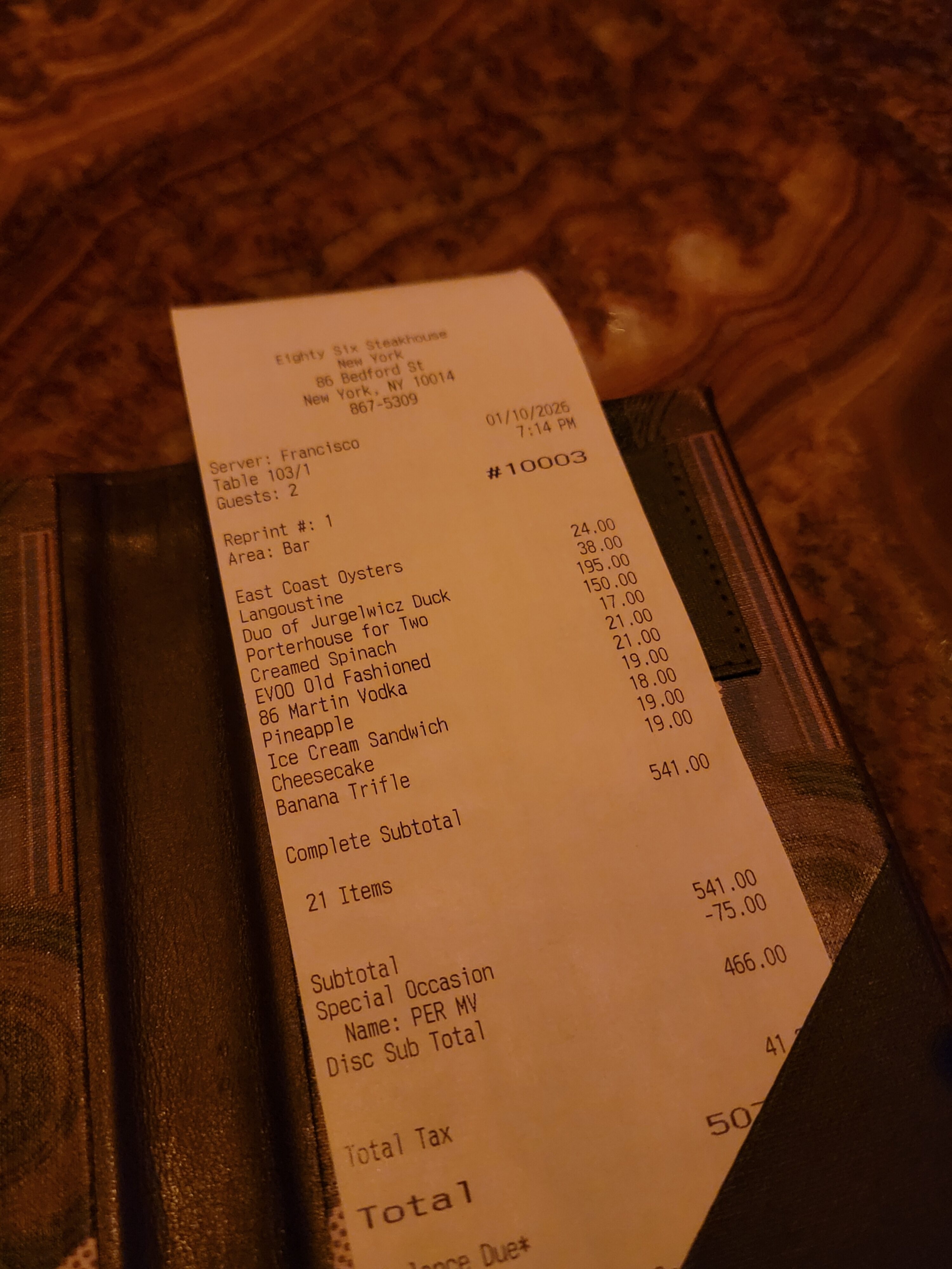 My instant reaction was that all of the prices were very fair, given how beef prices are insane, rent is insane, overhead is insane, etc. The porterhouse for two was $150 and the duck, which can easily feed four, was $195. They also went over the top for our special occasion (my wife’s birthday), and threw in a bunch of desserts on the house!