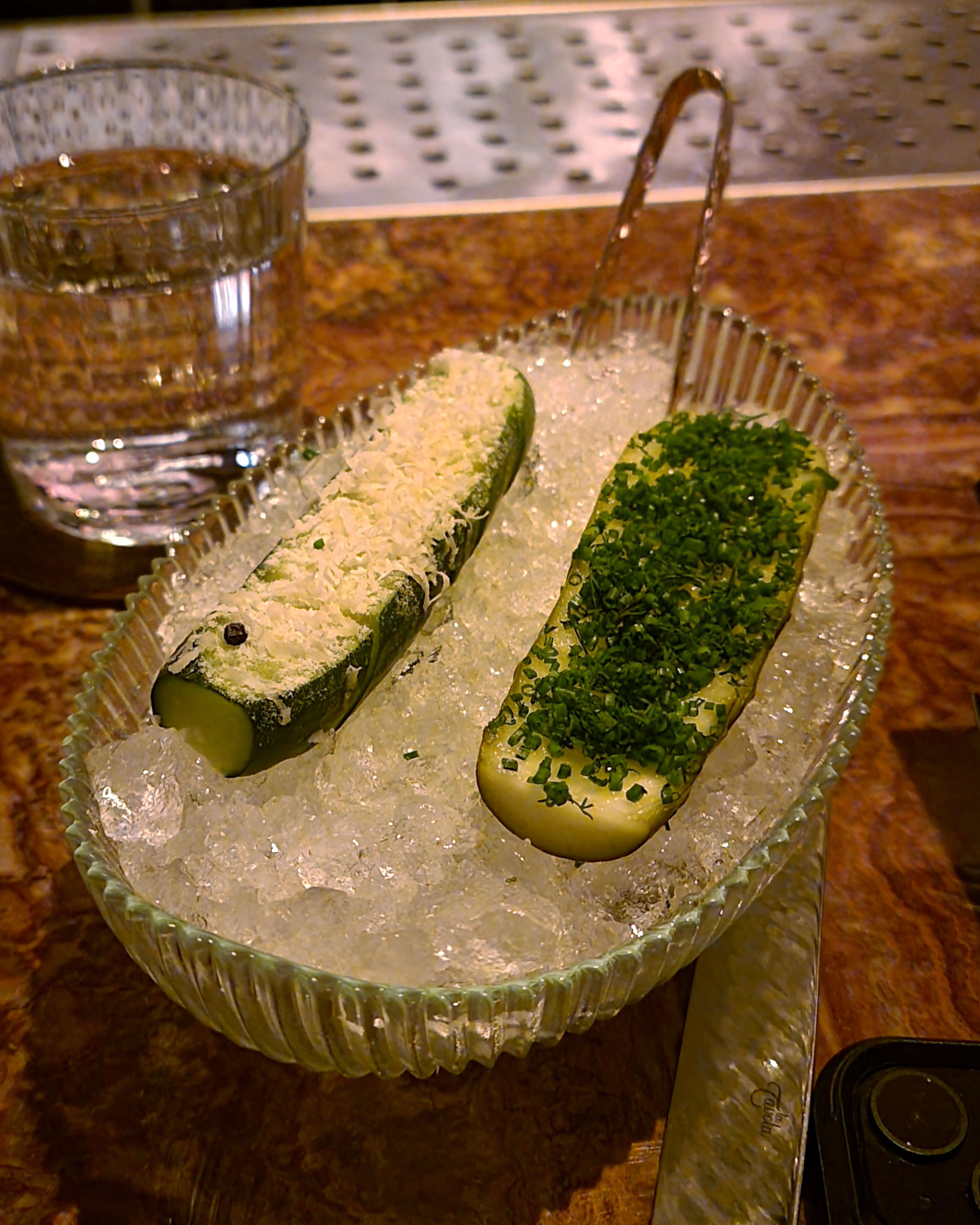 Table bread is swapped out for some really nice pickles – a low carb treat! One with wasabi and horseradish, the other with chives.