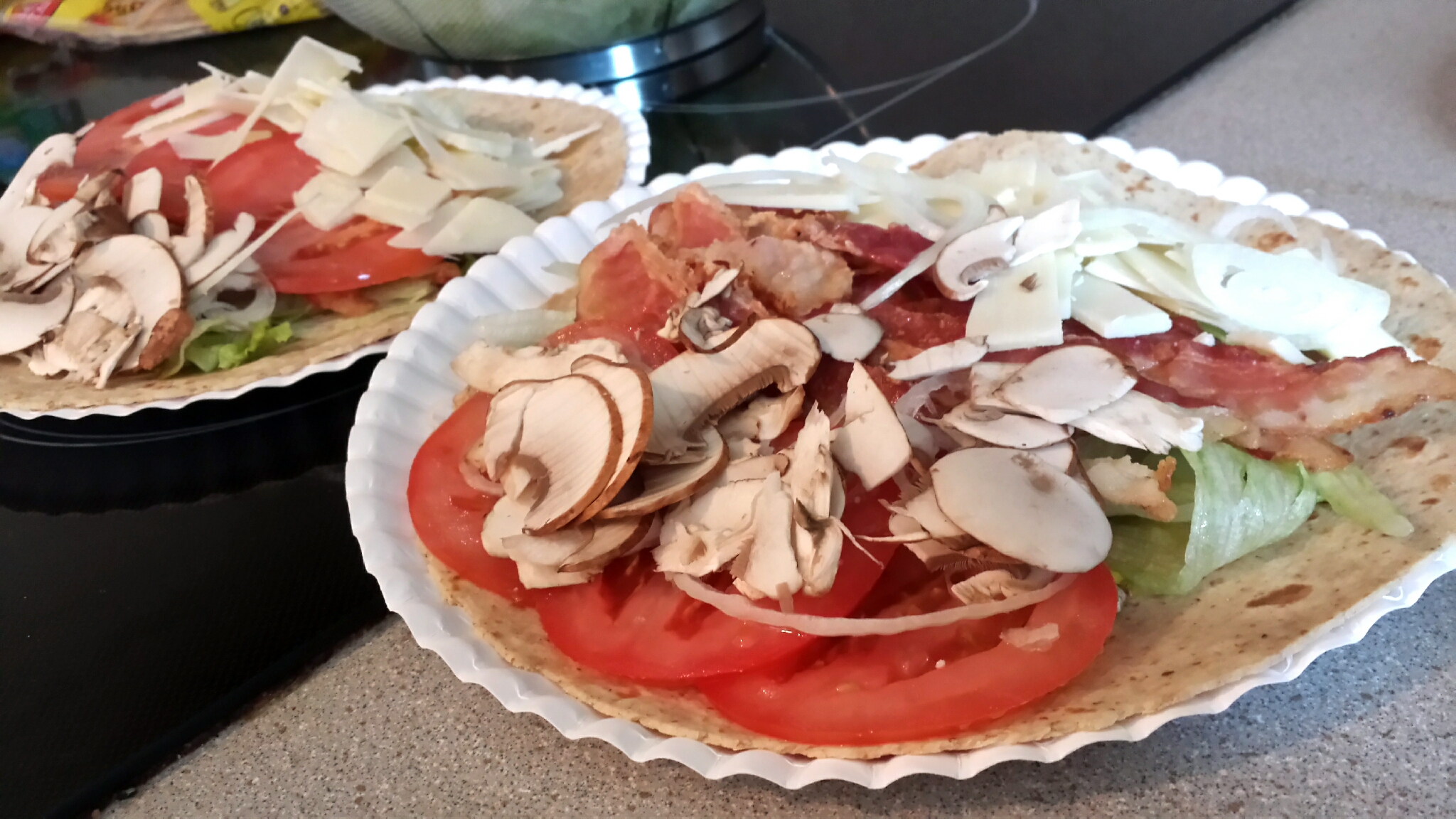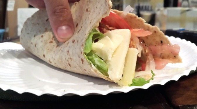 I used some whole wheat wraps we had laying around that I wanted to use before the move back to NYC. Add some sliced onions and mushrooms, cracked black pepper, and a little mayo or mustard to round it off, and you’ve got a queerly tasty sandwich. Get it? KNEE-SLAP!