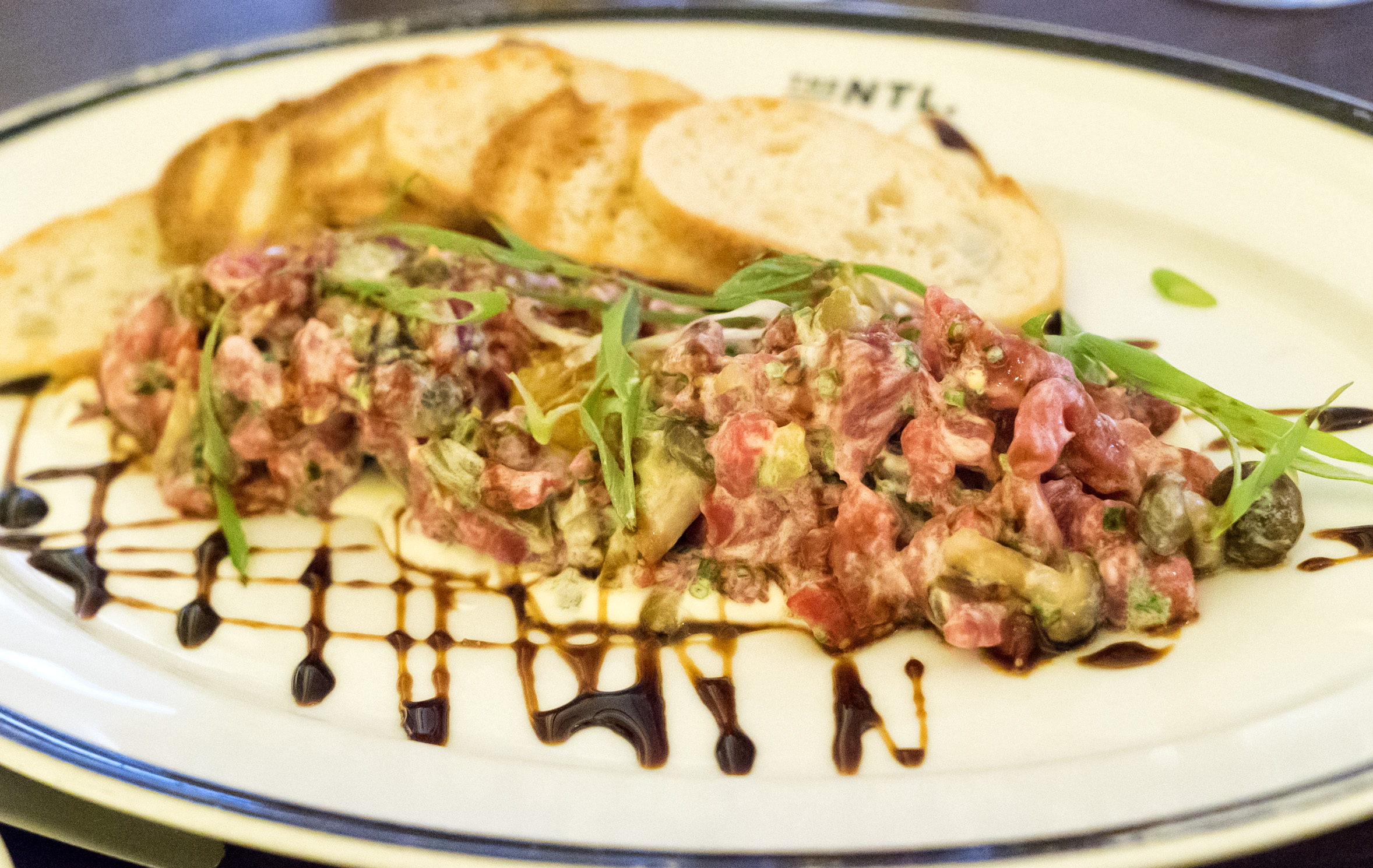 We thought it was odd that no bread was served to us, but the app came out pretty quick, and it had some sliced pieces of toasted bread with it. Steak tartare: