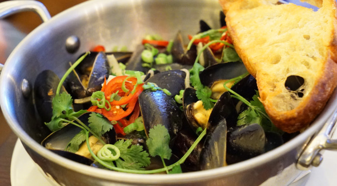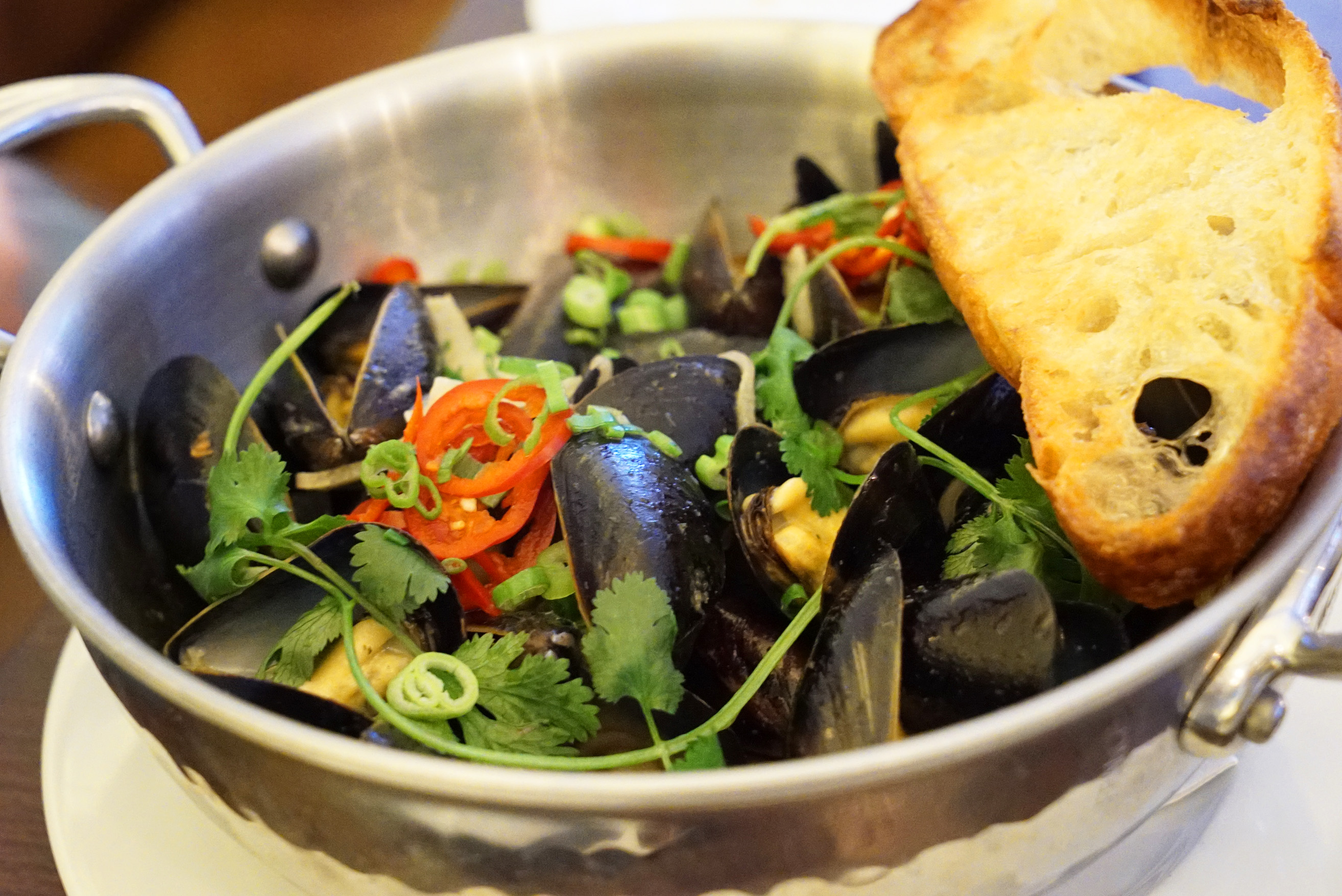 For her entree, my wife ordered the appetizer mussels. This was a good sized portion, but it came with one lousy piece of bread for soaking up the delicious green coconut curry sauce at the bottom. It was topped with sliced garlic, pickled chili peppers and cilantro.