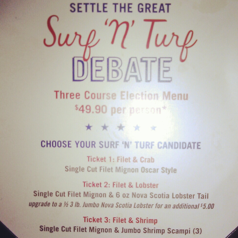 The Palm had a bunch of specials. One thing that bugged me, though, was that oysters were a special and not a regular menu item. In addition to that they had a lobster cocktail special item, a strip steak with cherry peppers, some italian food items, and a pumpkin creme brulee. In addition to that stuff, they offer several kinds of surf & turf deals (3 courses for $50 – the menu is pictured below); some with shrimp, some with lobster, etc. As far as other meats go, they have lamb (under the chops menu), veal and chicken (under the italian menu). Perhaps a pork chop would make for a good addition to the menu.