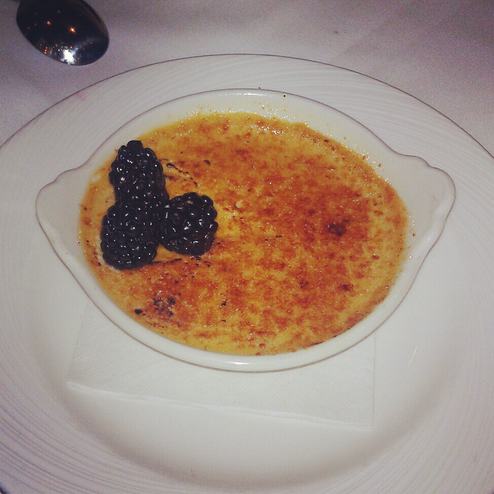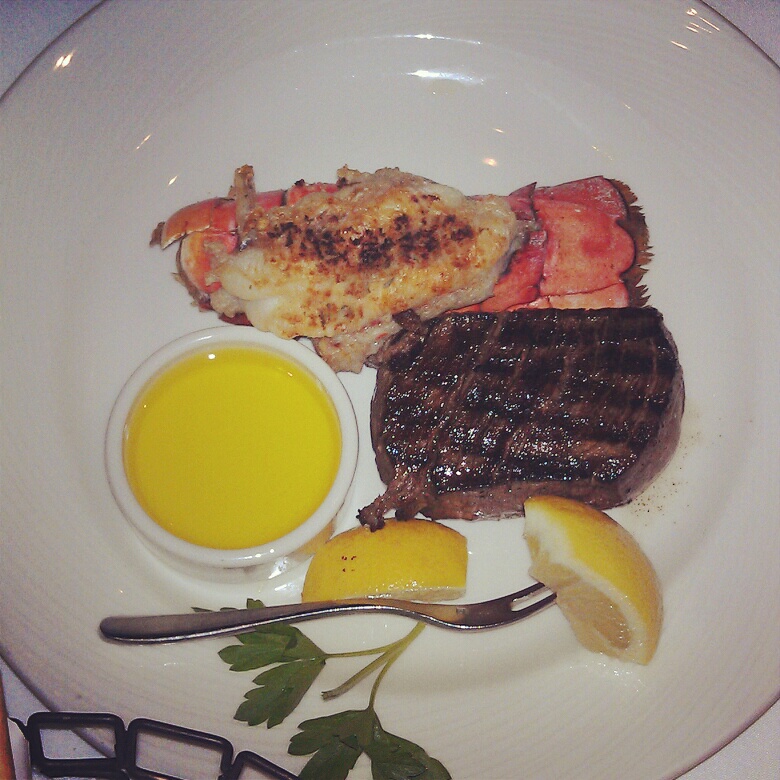 My wife had a basic mixed greens salad that came with her surf & turf. I had the crab cake. It was excellent – lots of meat, but still had good crisp texture. It came with a chipotle sauce that was perfect for an occasional dunk, and beside it was a cherry pepper and mango salsa; very nice. On the side we had creamed spinach, as usual. It was a little heavy (too much of the “cream” and not enough of the “spinach”), but you could tell it was made with top quality cheeses. For dessert we shared a pumpkin creme brulee, which came with my wife’s surf & turf (see below). It was a little grainy due to the addition of pumpkin, but tasty nonetheless.