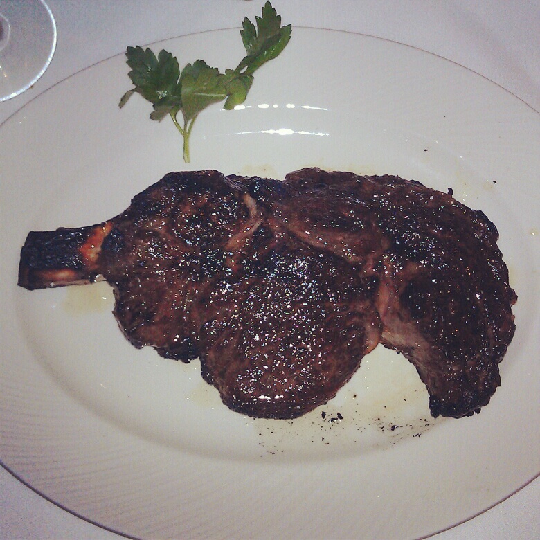 The sizes are good here, and everything seems to be prime caliber. The ribeye was 24oz on the bone, and 18oz off. The strip was 16oz. Filets are 9oz or 14oz, and as I mentioned above they don’t skimp out when you do the surf & turf deals. The creamed spinach was tremendous (see pic below) – unfortunately I only had two bites of it. The servers forgot to bring out the doggie bag to take that home (couldn’t finish). Oops. The plating was basic, and it’s really simple to achieve: cook meat, place meat on plate, serve. I’m cool with that. But that little bit of parsley?!?? Make it cilantro and I’ll eat it. Parsley is as useless as tits on a bull. I’m a fucking man for God’s sake. I don’t need a sprig of parsley on my plate or a tweel of balsamic infused chocolate sticking out of my potatoes for that matter (didn’t happen here, but it DOES happen). Dear chefs who do that: Go fuck yourselves. Sincerely, Johnny Prime. PS: What’s the difference between parsley and pussy? You don’t eat parsley…