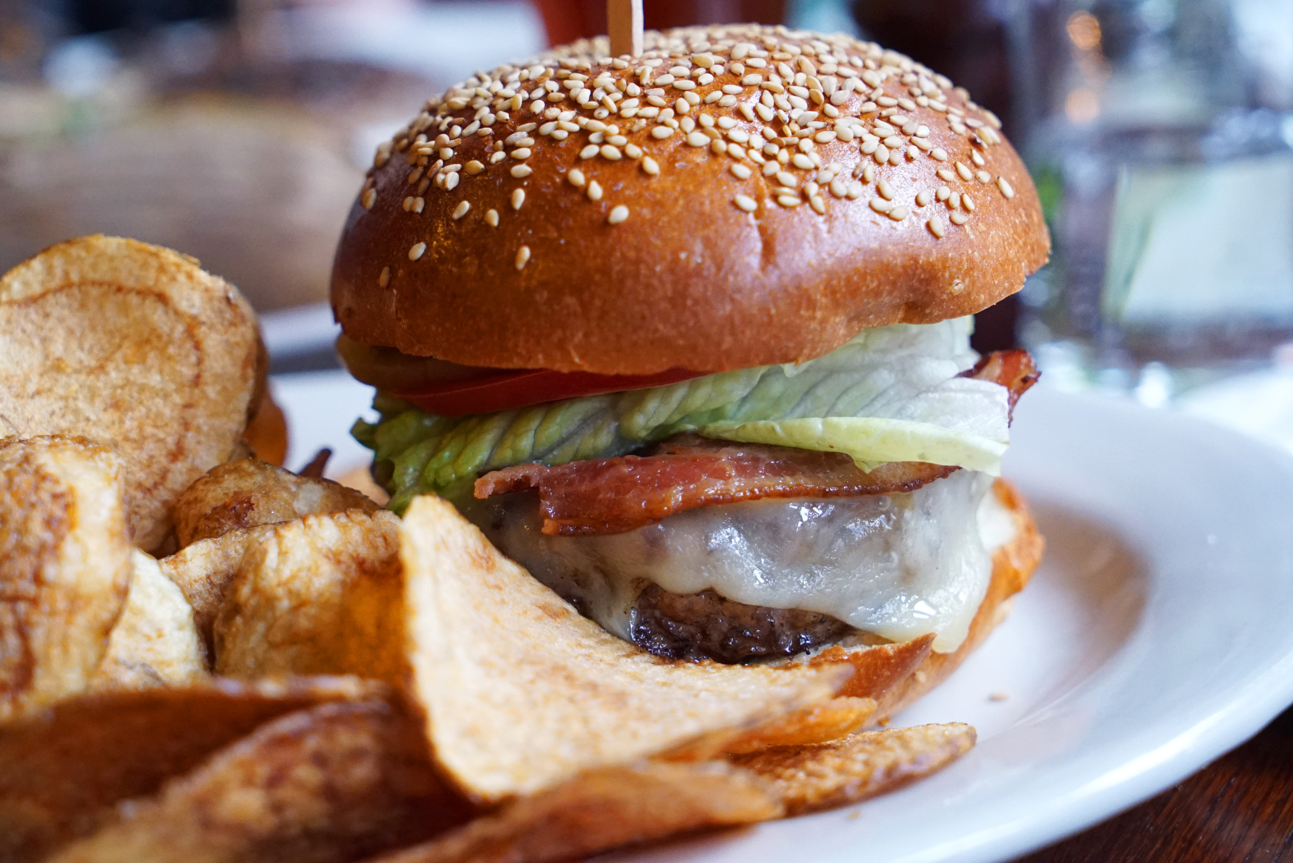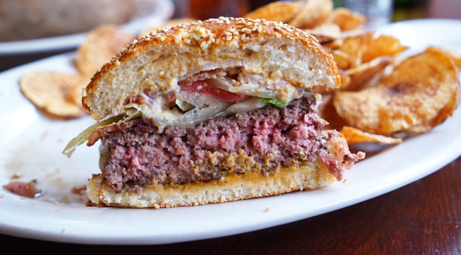 Here’s the burger plate, which comes with thick-cut, house made potato chips (they were crispy and well seasoned, though a few were a little over-burnt for my liking).