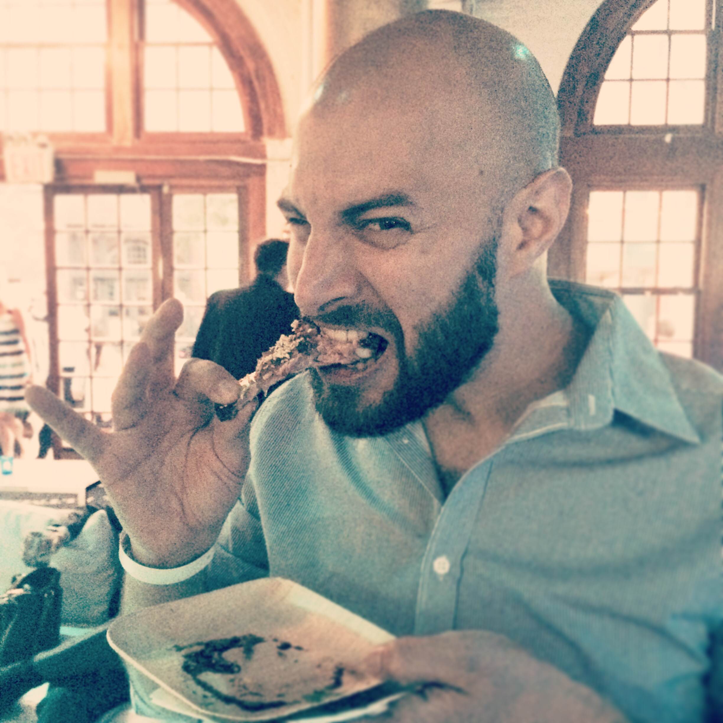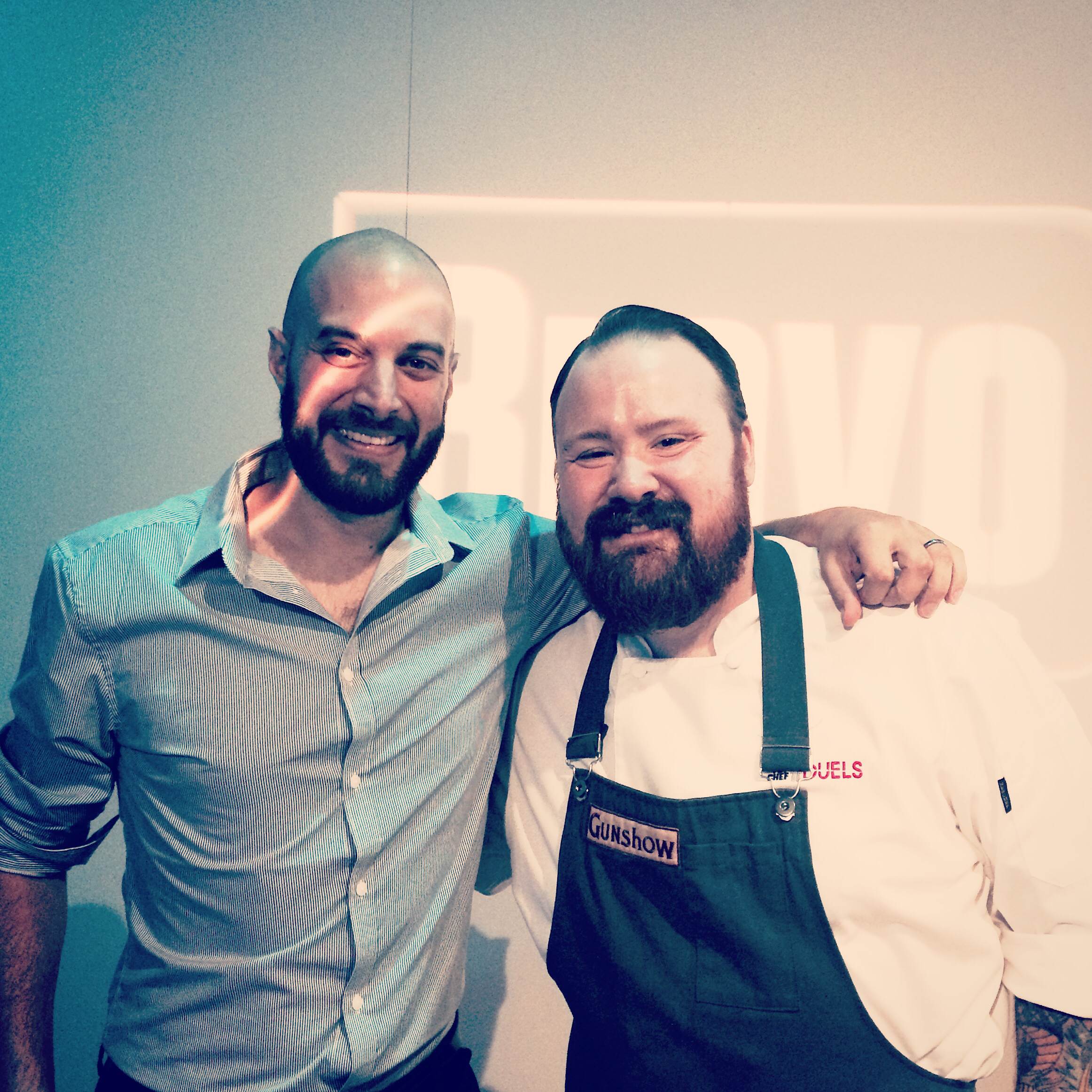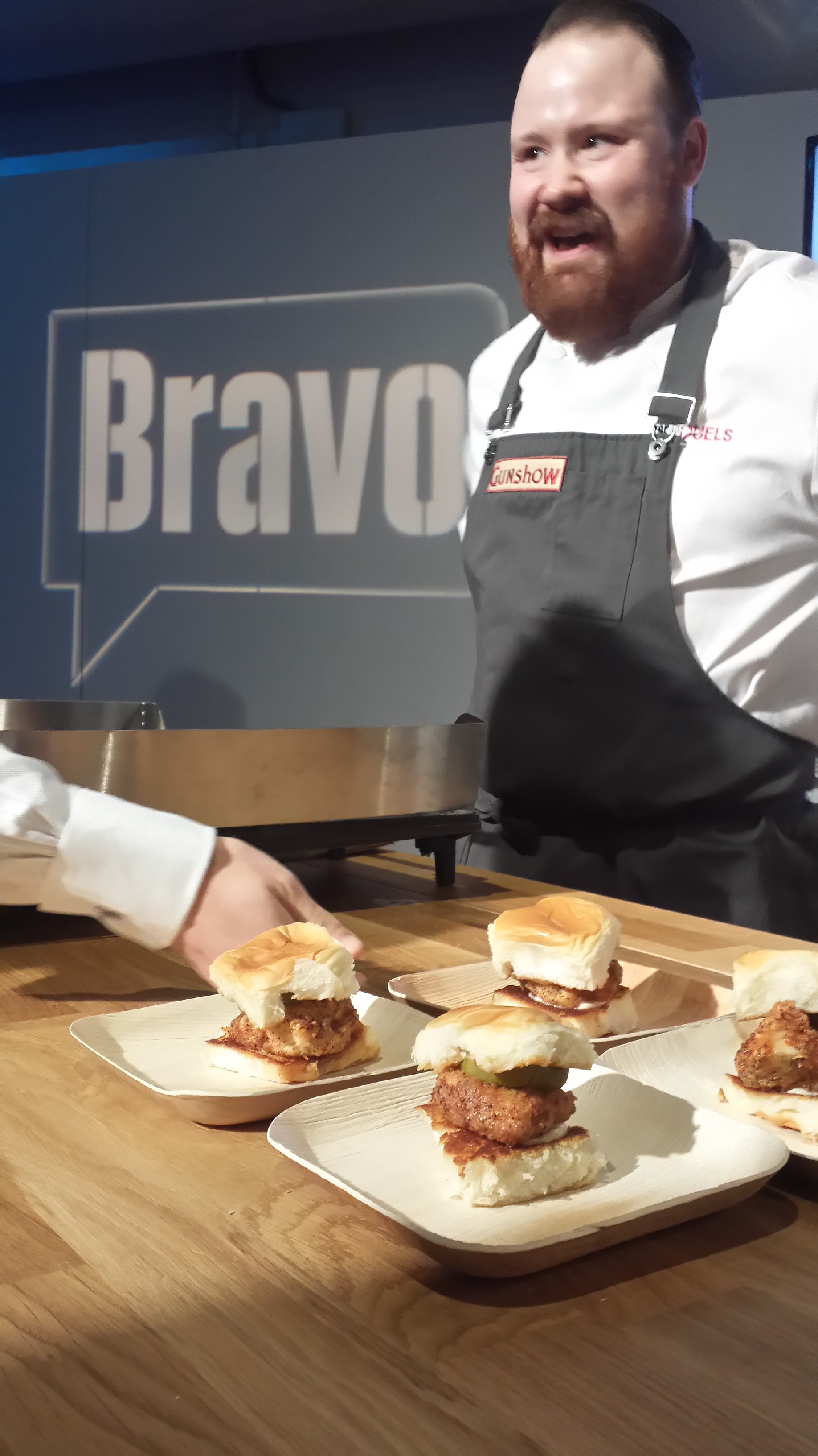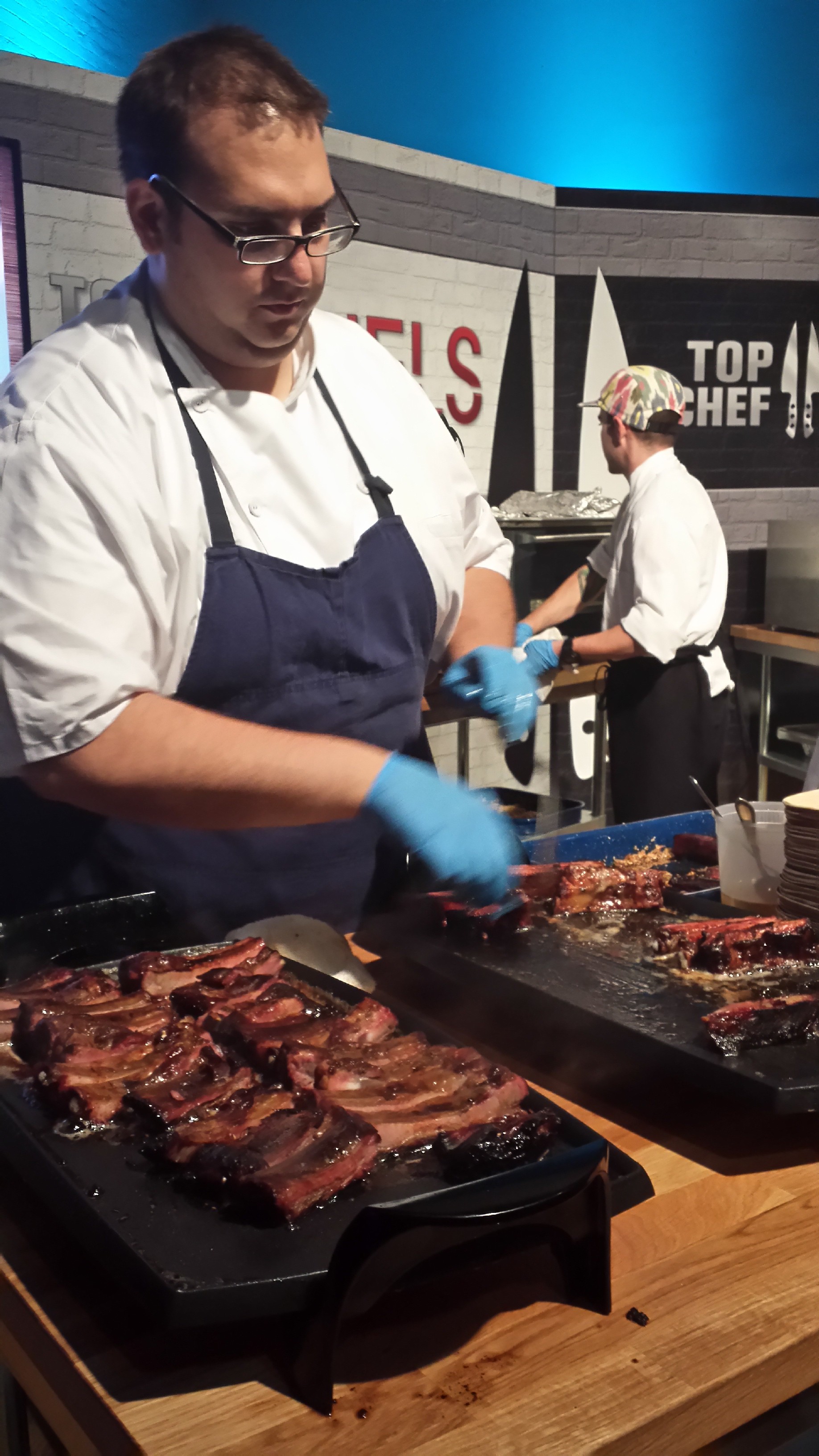 One thing I appreciated about Art’s dish was that it was a nice, full piece of fried chicken on the bone, readily identifiable as such, like Tiffani’s rib (and unlike Dale’s). In typical southern style, Art’s dish contained a hint of maple syrup to throw your taste buds back into breakfast mode. It was good! But Kevin’s sangwitch was masterfully created. He was working like a powerhouse all night, didn’t mix and mingle too much. He just kept right on working his station. Amazing. And his passion for cooking shines through his food, because that chicken slider was one of the best poultry-based dishes I’ve ever eaten. People were going up for seconds and thirds. Even Top Chef alumnus CJ Jacobson asked me to run and grab him one while he was stuck in the cattle pen pretending to be interested in talking to, and taking pictures with, obsessed fans. I earned a solid fist bump from that human beanstalk for being his sandwich bitch.