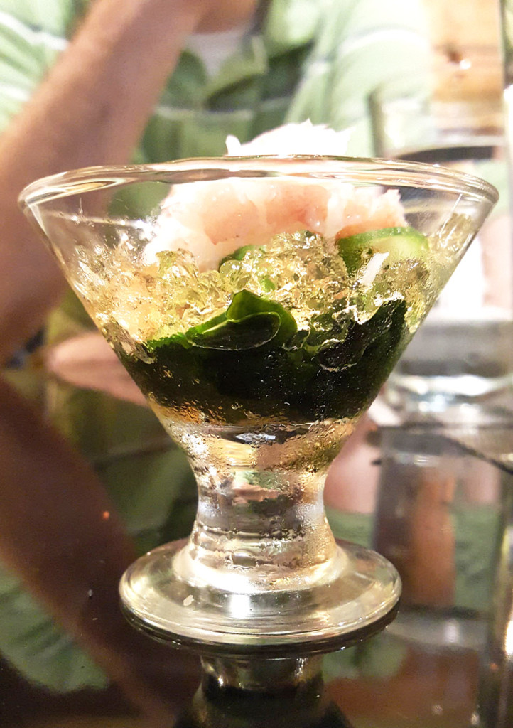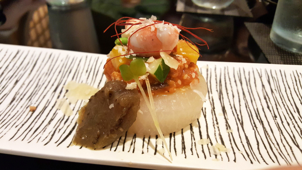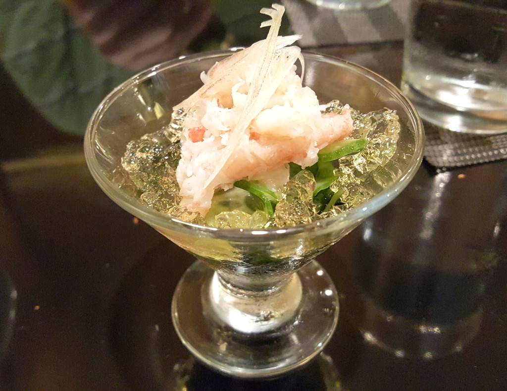 Crab and shrimp with black mushrooms and yuzu jelly: