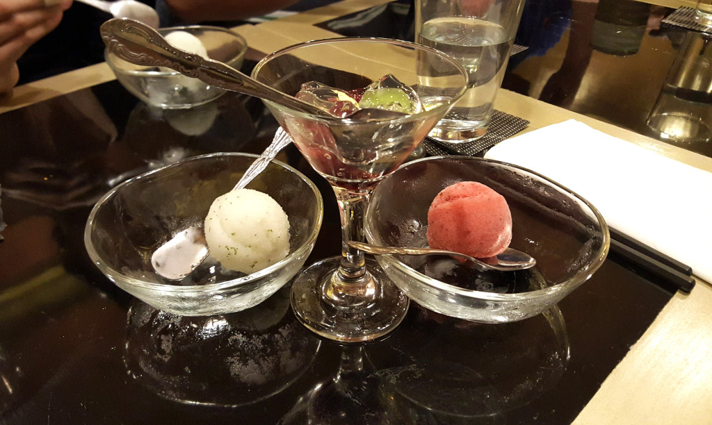 Dessert was either a shiso sorbet (left), sake jelly with kiwi and cherry (center), or strawberry sorbet (right). I went with the shiso sorbet and absolutely loved it. Very refreshing.