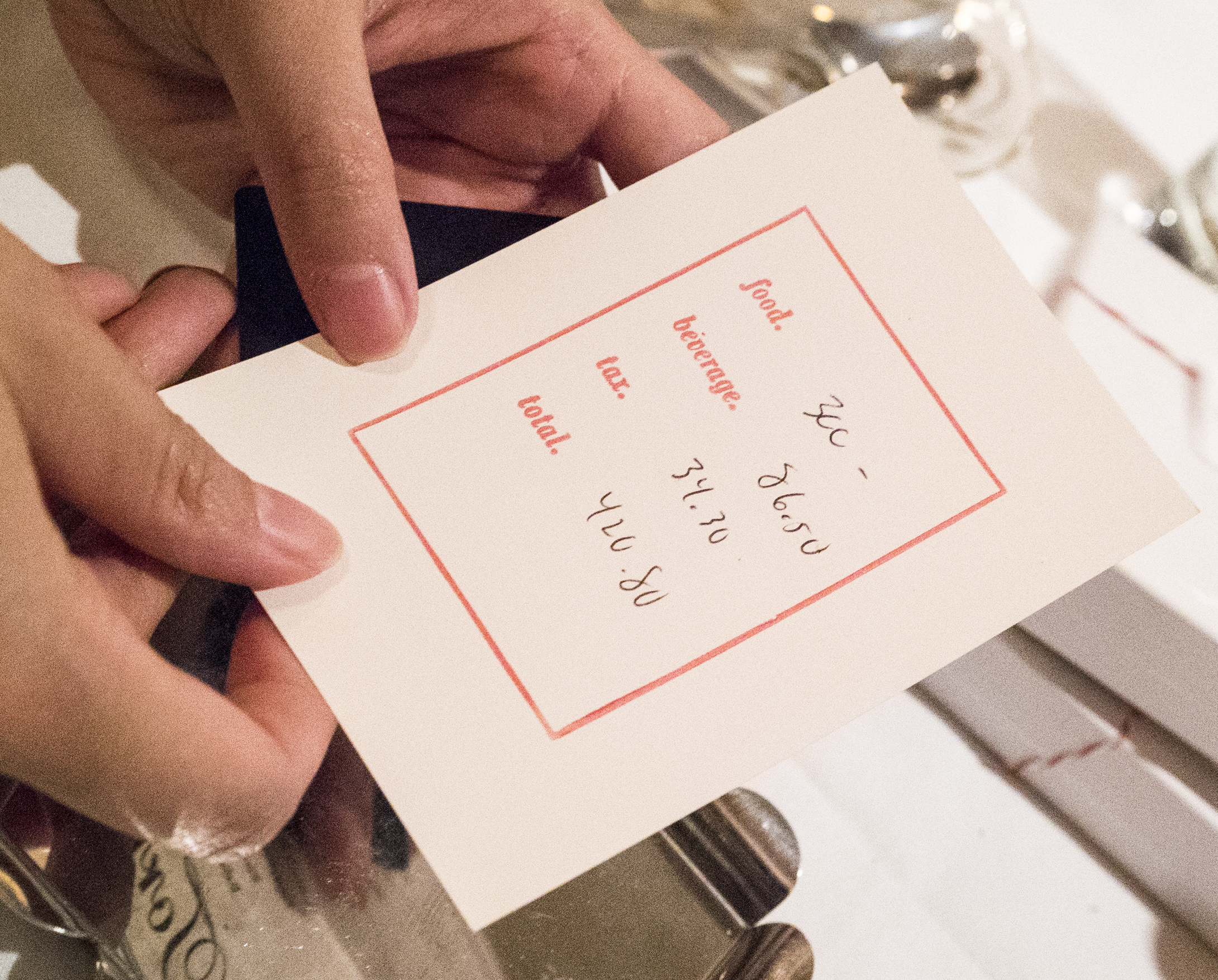 So that’s about it. I liked the meal very much, but I felt it was a bit expensive for the small portion sizes (despite it being a ten course tasting menu I was still hungry afterwards). That said, I doubt I’d come back unless it was for some sort of special event. Here’s the bill for three people: