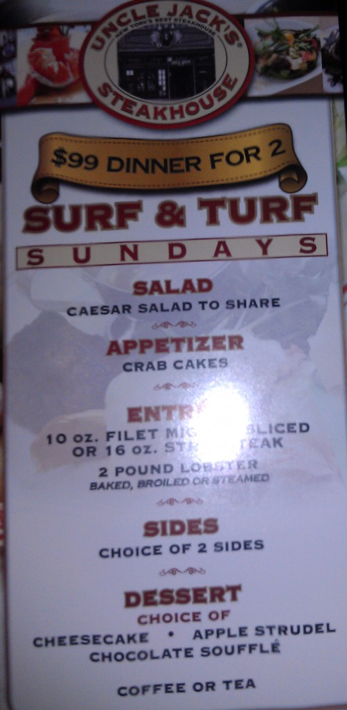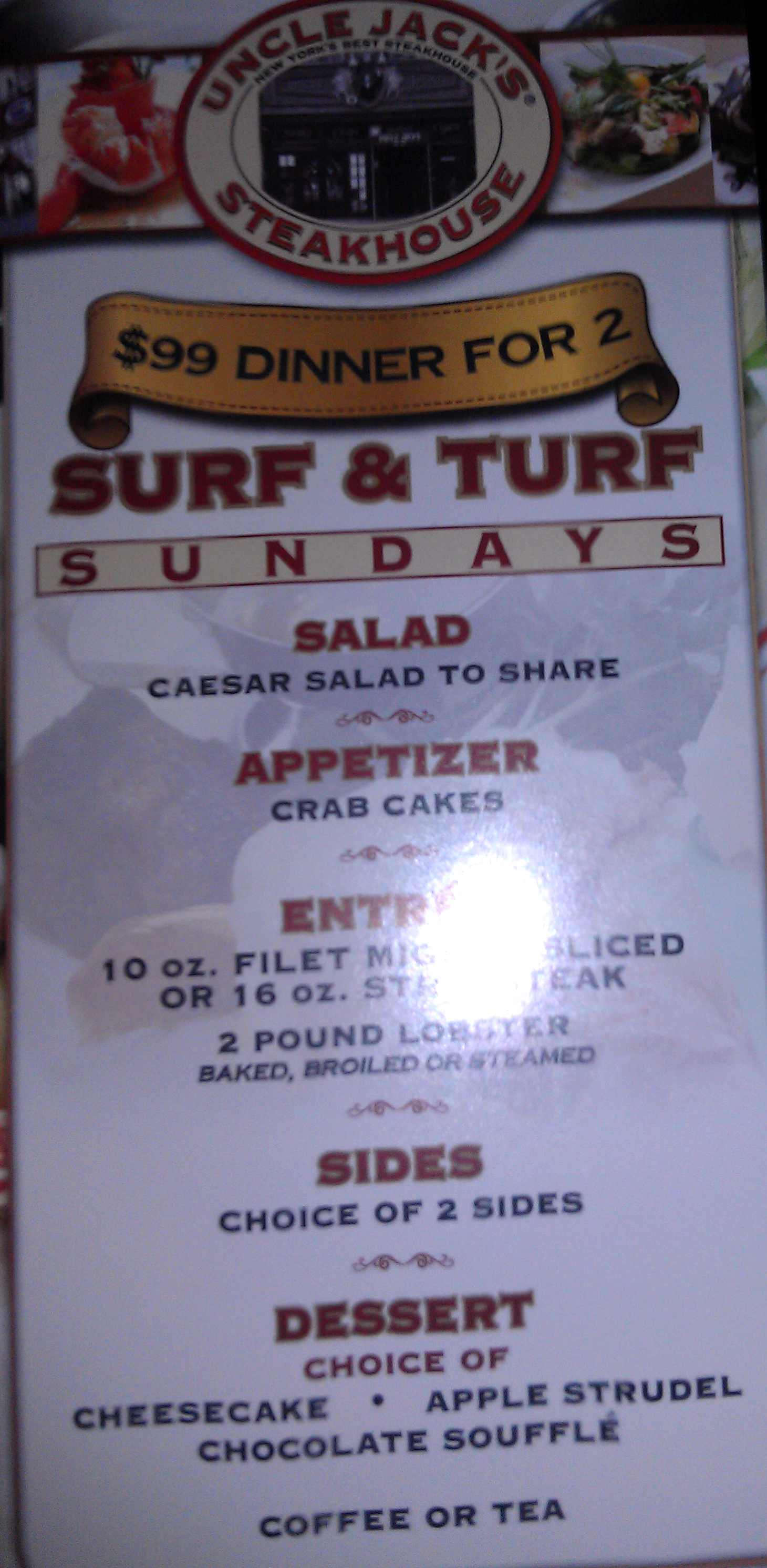 Uncle Jack’s has no real seafood entrees, aside from a surf and turf item. I am fine with that, but it’s a good thing I have balls between my legs, otherwise I might have wanted something more lame, like fish. For apps, they have the usual smattering of shellfish and seafood cocktails, but I can’t give a high review. See above. Without anything to offer, I can’t give full points, even though I dig their boldness for holding strictly to beef.