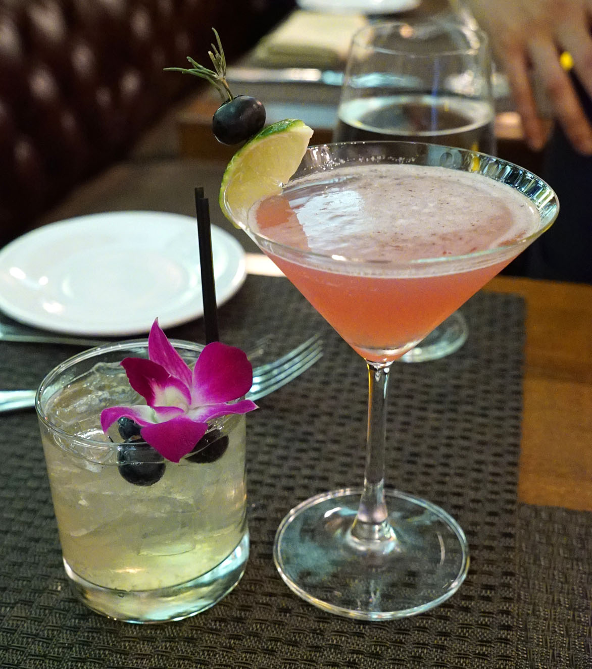 There’s a small bar up by the street, with seating for about six people. There’s also some tables up there that are oriented to be somewhat part of the bar area. The wine list is extensive, there’s a good selection of beer, both in bottles and on tap, and they make some interesting cocktails. These were the “Meet Me Here” (lowball) and the “Fig Blossom” (martini glass) cocktails.