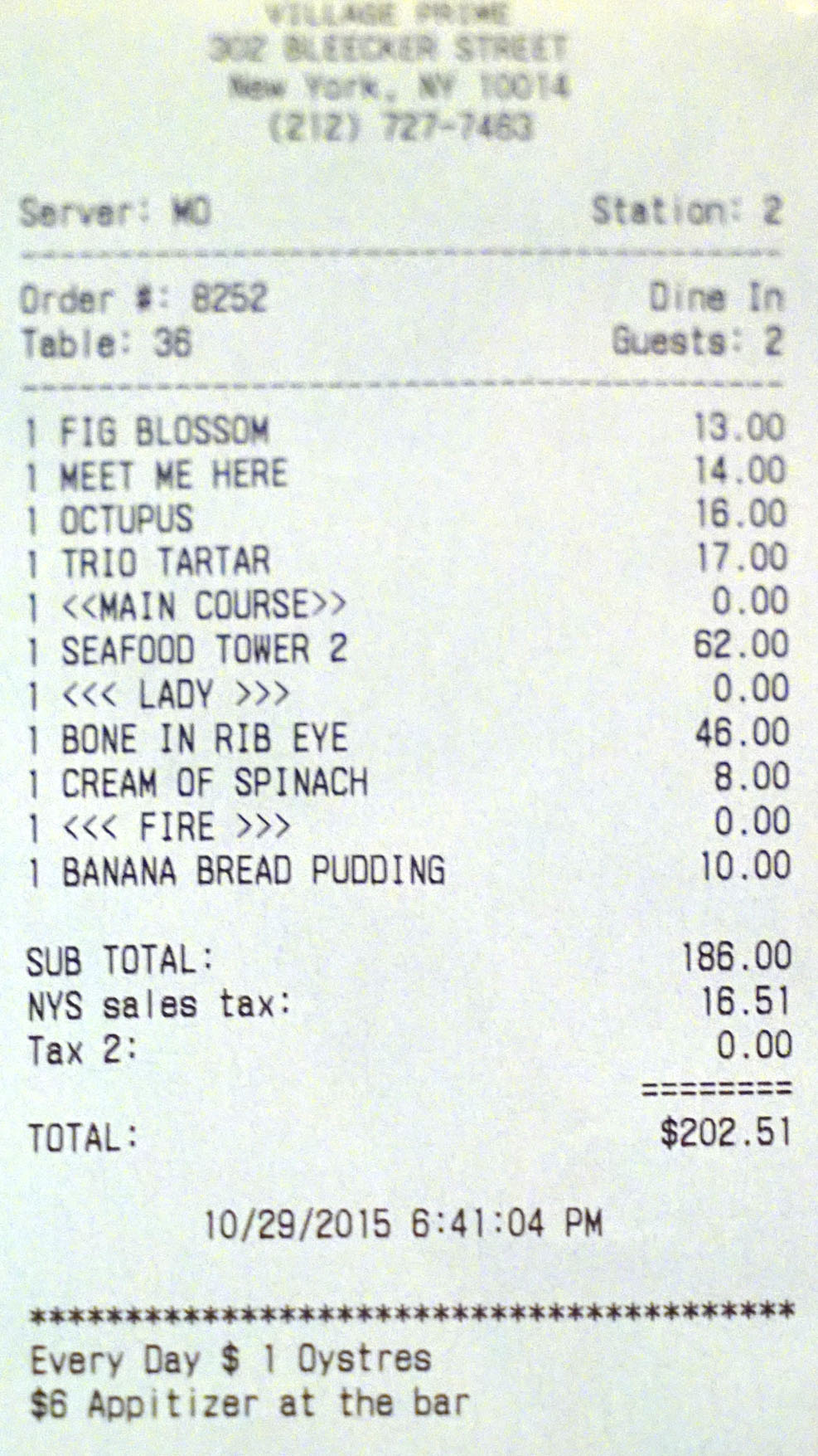 At $46, the rib eye seemed to be priced right for a smaller mom and pop type steakhouse, but I was a little bummed when it didn’t deliver the flavor I had hoped for. But that wasn’t really the issue in terms of price. For the steak, I didn’t feel ripped off. But the seafood tower “for two” was a complete waste of money at $62. The four shrimp were great, as well as the four oysters and four mussels. We ate those first. By time we got to the mushy, weird-flavored small lobster tail and mushy, shell-ridden crab  meat, we figured it was sort of too late to send it back or complain on the spot. Had we tasted that stuff first, maybe we would have sent it back. The lobster and crab were both mushy and grainy, as if the texture of the meat had broken down somehow. Maybe it was old or not properly cleaned. Also, mussels are cheap – a few cents each at the most to purchase fresh. Seeing mussels in place of something nice like littleneck clams on a seafood tower like this is pretty much bullshit. FOUR???!? If this had a dozen mussels it would still be a fucking rip off. At $62 we felt completely taken when the “market price” bill came to the table. Not only was this the skimpiest seafood tower we have ever ordered, but it was probably the most expensive as well. A third complaint on price has to do with the cost of a glass of amaro. A full bottle of Amaro Nonino costs about $40, depending on where you purchase it. I noticed that the menu listed a glass of this average, common, easy to find amaro at $34. What the FUCK is going on here? It was priced higher than all of the scotches on the menu. Unbelievable. Either that’s a really bad typo, or someone has no idea of the actual value of this digestif. Fuckin’ $34… Anyway, I didn’t even order that but I felt compelled to discuss it. The overall take away for price here is that we felt like we overpaid even WITH the $60 off Living Social deal. Here’s the bill, before the $60 came off:
