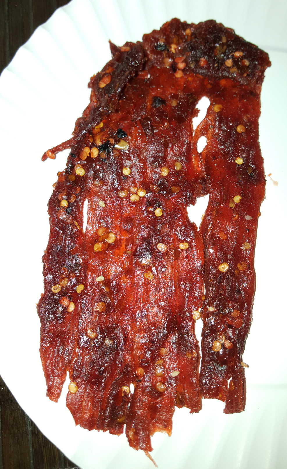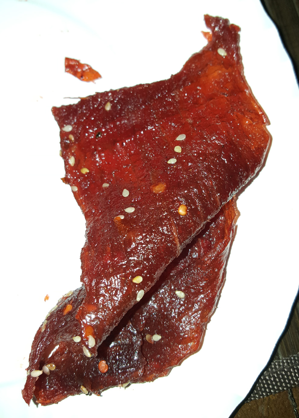 This stuff is nothing shy of amazing. So far this might be the best tasting jerky that I’ve ever had. The only down-side is that it is messy as fuck to eat. This isn’t ideal for laying on the couch and popping into your mouth while you watch a movie of flip through the TV channels. Who does that anymore, anyway? We fucking scroll through the on-screen guide looking for something better than whatever channel the TV happens to be on, or we comb our DVR’s for a show we can finally start to binge-watch, now that there are more than five of six of them recorded. Anyway… Back to business. You need a plate and several napkins when you eat this stuff. It’s fucking crazy messy. You’ll be shocked when you see how far some of the bits and pieces of tasty shit fly when you pull it apart for smaller, more manageable-sized pieces. Pictured below are the regular and spicy beef versions, but they have tons of variety to choose from. The spicy is VERY spicy. I love it.