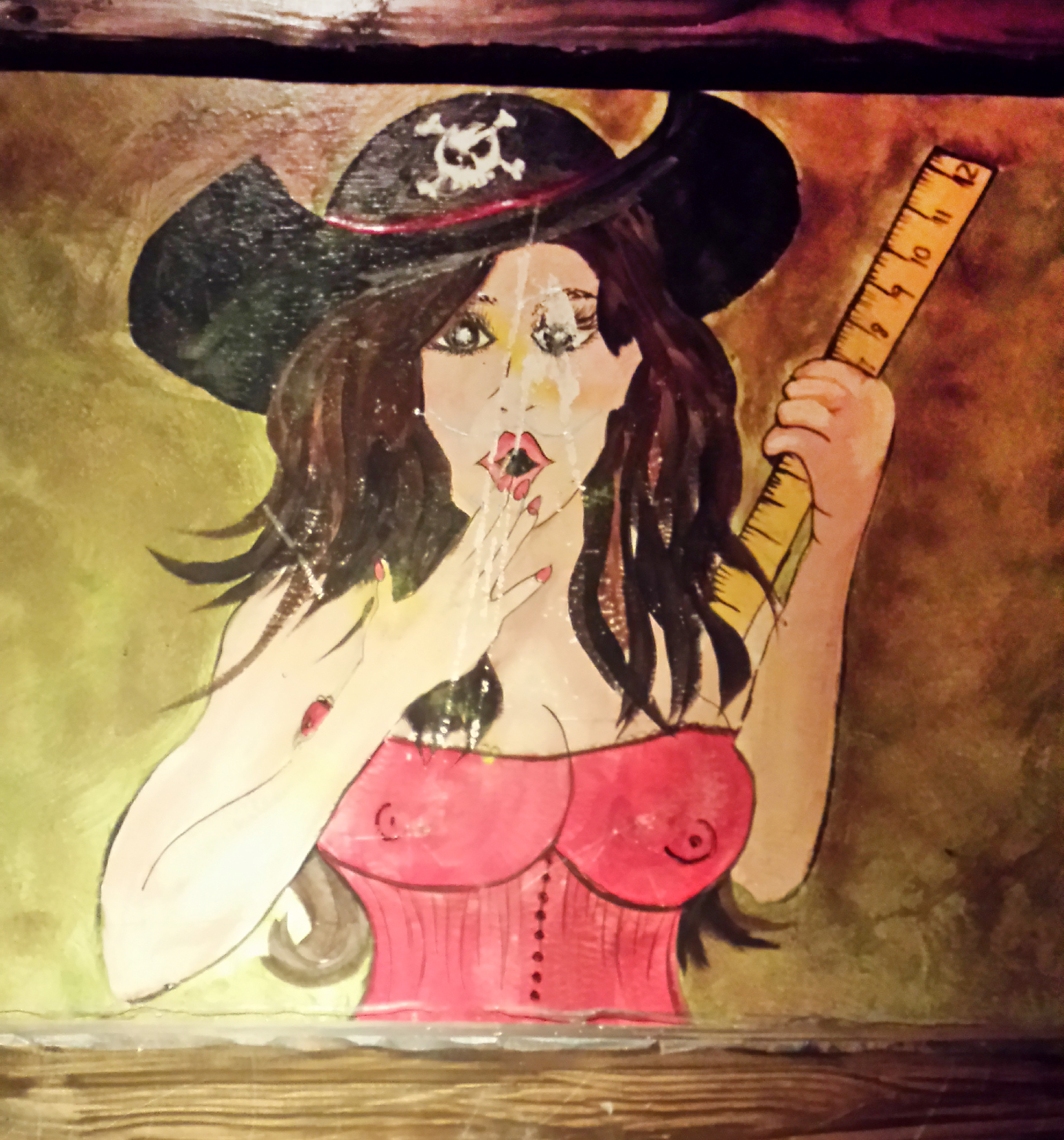 Decent burger, fun bar, and I kinda liked the pirate theme. They play live music and even have peer pong tables set up, with a massive projector screen in the back room as well. Here’s a photo of some broad who was measuring dicks in the men’s bathroom: